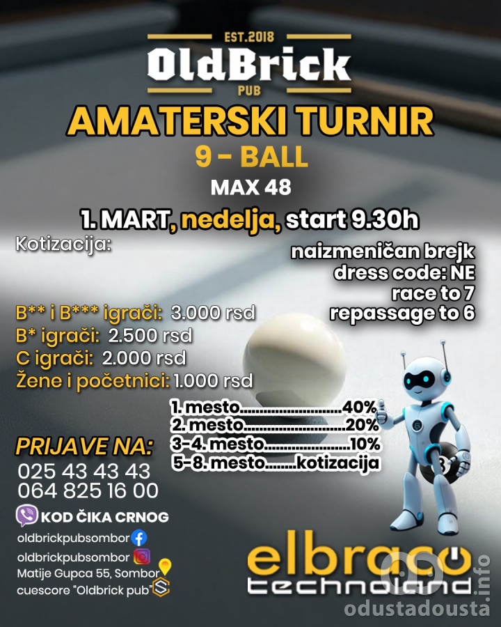 Sombor ponovo postaje centar okupljanja ljubitelja igara na talonu. U nedelju, 1. marta 2026. godine, popularni Old Brick Pub domaćin je velikog Amaterskog turnira u disciplini 9-ball. Takmičenje počinje u ranim prepodnevnim časovima, sa startom zakazanim za 9:30h.