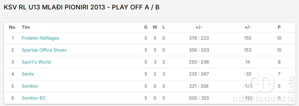 Tabela plej-ofa Regionalne lige do 13 godina  2