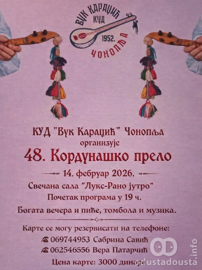 ČONOPLJA – Kulturno-umetničko društvo „Vuk Karadžić” iz Čonoplje organizuje jubilarno, 48. Kordunaško prelo koje će se održati u subotu, 14. februara 2026. godine.