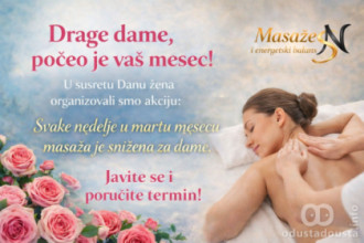 Povodom 8. marta, tokom celog meseca, subotom i nedeljom, sve dame ostvaruju popust od 10% na sve masaže i tretmane. Iskoristite priliku da se prepustite rukama stručnjaka u ambijentu koji je u potpunosti podređen vašem miru.