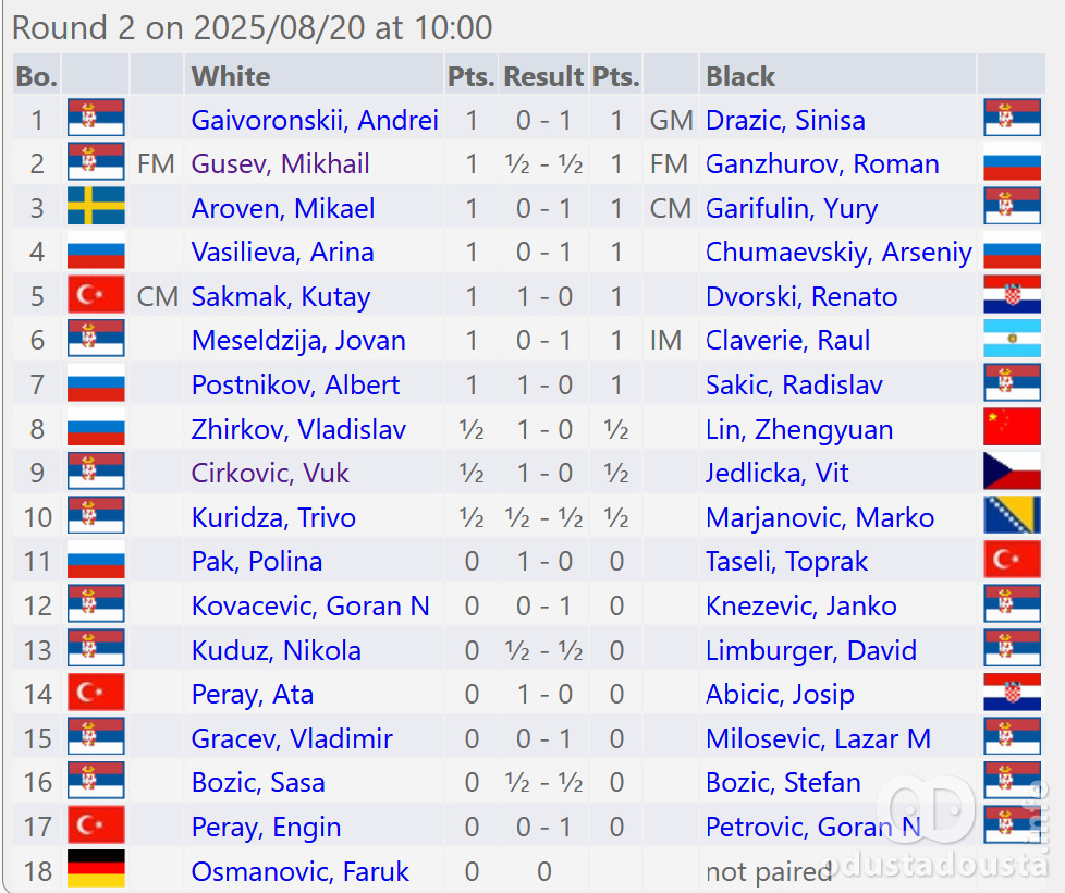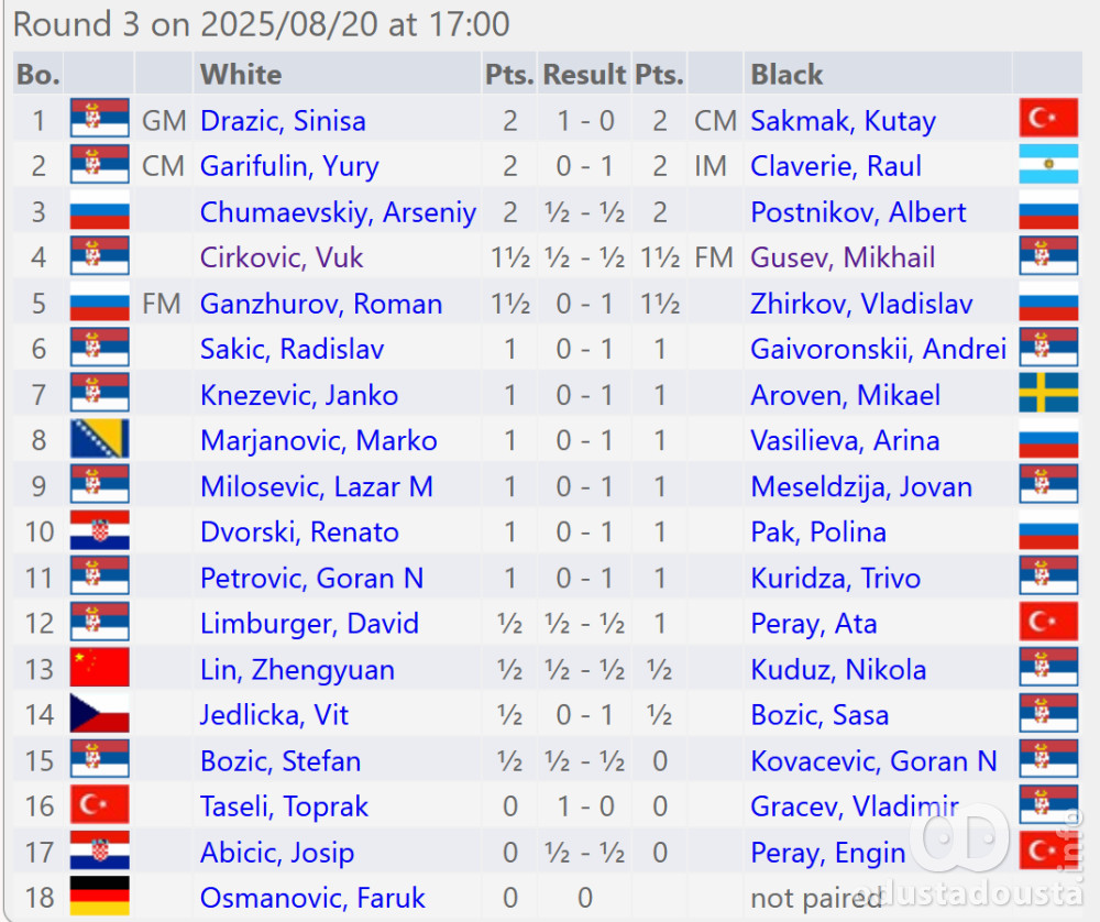 Nakon današnjeg duplog programa i ukupno trećeg odigranog kola, na šahovskom turniru "Apatin open - Liberlend 2025." sa maksimalnim učinkom od 3 pobede su dva igrača sa najvišim šahovskim titulama, srpski velemajstor Siniša Dražić i argentinski intermajstor Raul Claverie. U stopu ih prate tri ruska tinejdžera: Arseniy Chumaevskiy, Albert Postnikov i Vladislav Zhirkov sa pola poena manje (2,5).