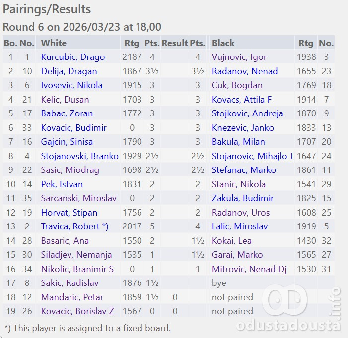 Večaras od 18 h, u prostorijama Somborskog šahovskog kluba (Čitaonička 9) na programu je 6. kolo.