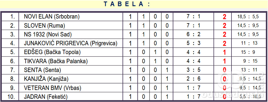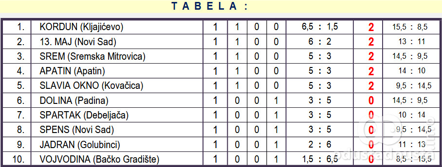 Tabela Druge vojvođanske lige nakon 1. kola