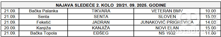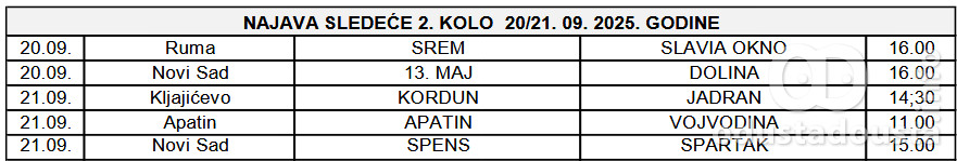 U narednom, 2. kolu, Apatinci su domaćini "Vojvodini" iz Bačkog Gradišta. Njihov susret zakazan je za nedelju, 21. septembra 2025. godine sa početkom u 11 h.