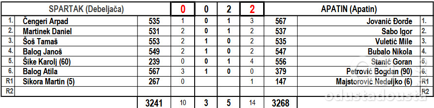Napeto je bilo u susretu u Debeljači, između domaćeg "Spartaka" i gostiju iz "Apatina" u okviru 1. kola Prve lige Srbije - grupa Vojvodina u kuglanju. Na kraju prevagu na stranu Apatinaca odneli su ekipni čunjevi za konačnih 3 : 5.