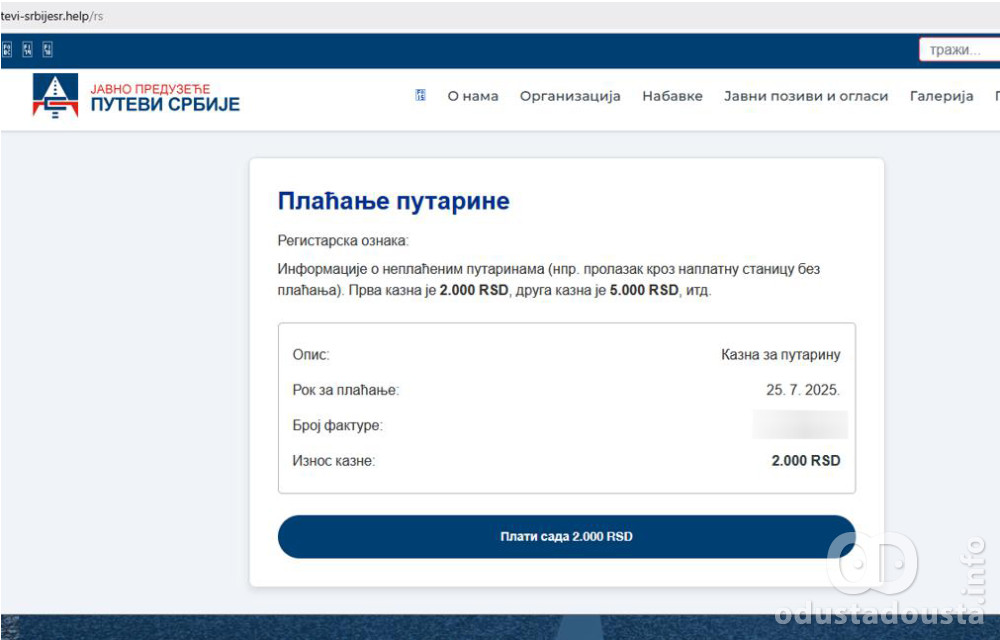 Izgled lažne stranice JP Putevi Srbije za prevaru plaćanja kazne za putarinu