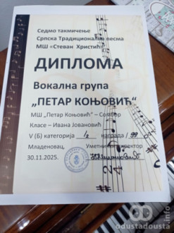 Na takmičenju srpske tradicionalne pesme u Mladenovcu, pevačka grupa srednje škole osvojila je prvu nagradu sa ukupno 99 bodova.