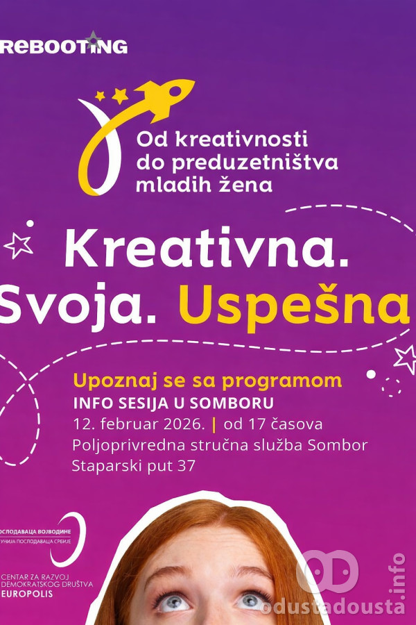 Unija poslodavaca Vojvodine i Centar „Europolis“ pozivaju mlade i ambiciozne žene iz Sombora na info sesiju posvećenu programu „Od kreativnosti do preduzetništva mladih žena“. Promocija će se održati u četvrtak, 12. februara, sa početkom u 17 časova.